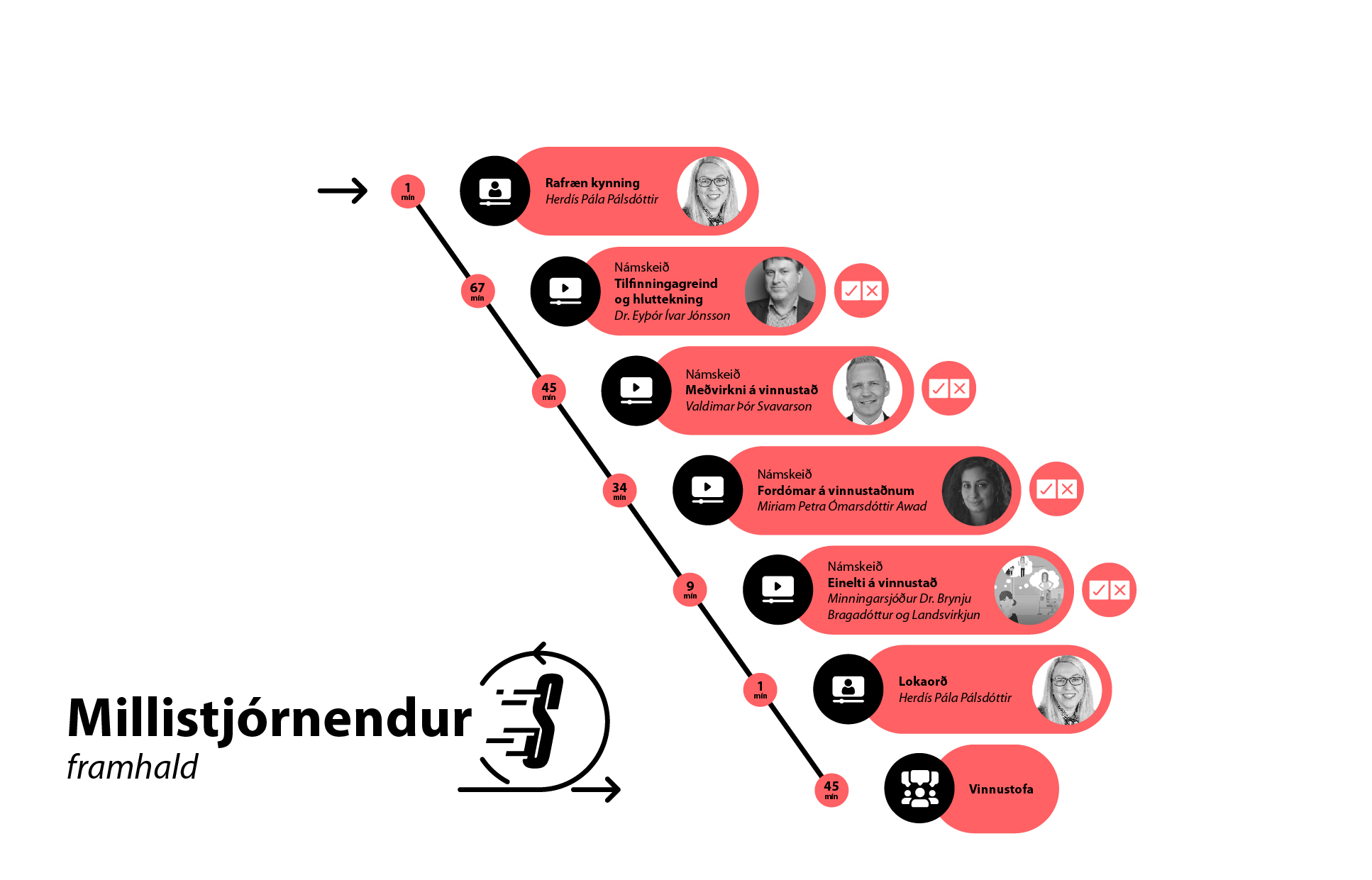 Vinnustaðir hafa kost á að fá StjórnendaSprettinn inn í sín kennslukerfi sem inniheldur þá upptöku á kynningu frá stjórnenda vinnustaðar, verkefni og krossaspurningar.
