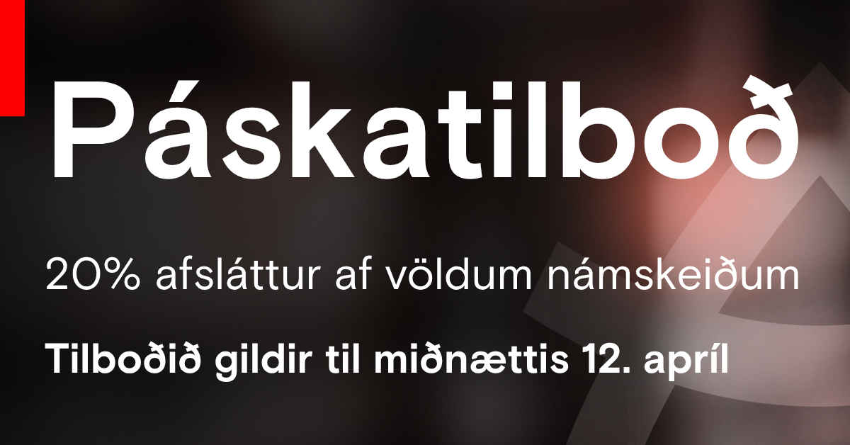 Fram til miðnættis 12.apríl næstkomandi er 20% afsláttur af völdum námskeiðum hjá okkur af námskeiðum sem framundan eru fram að sumri.